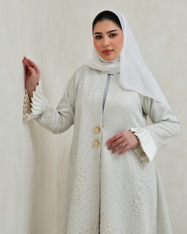 عباية أنيقة باللون الأبيض مع تداخل الذهبي مع إضافة أزرار الورود الذهبية