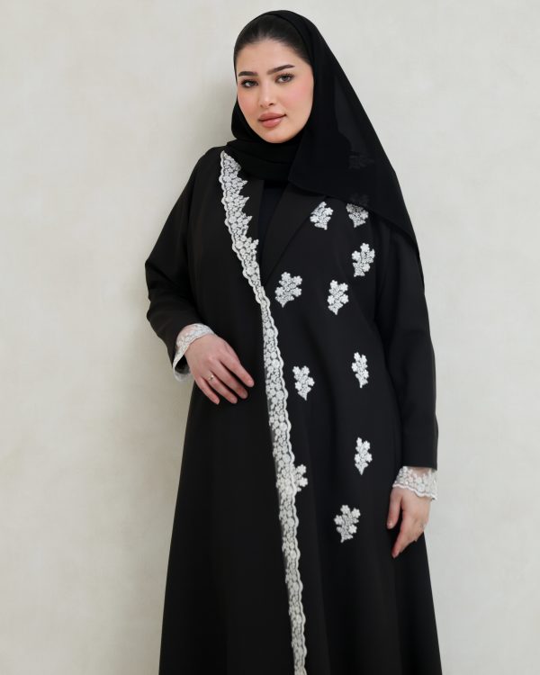 عباية باللون الاسود مع اضافة تفته ابيض مطرز بالورود السوداء.