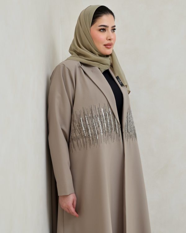 عباية باللون البيج مع تطريز باللون الزيتي و الشك الفضي