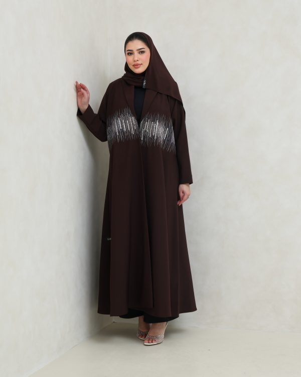 عباية باللون البني مع شك بالون الكحلي و تطريز الفضي