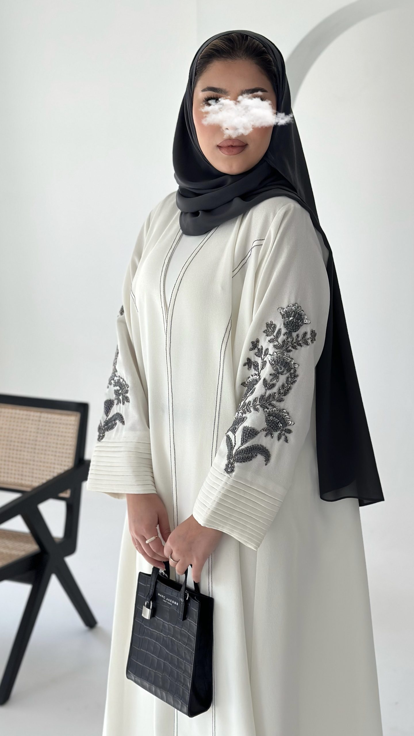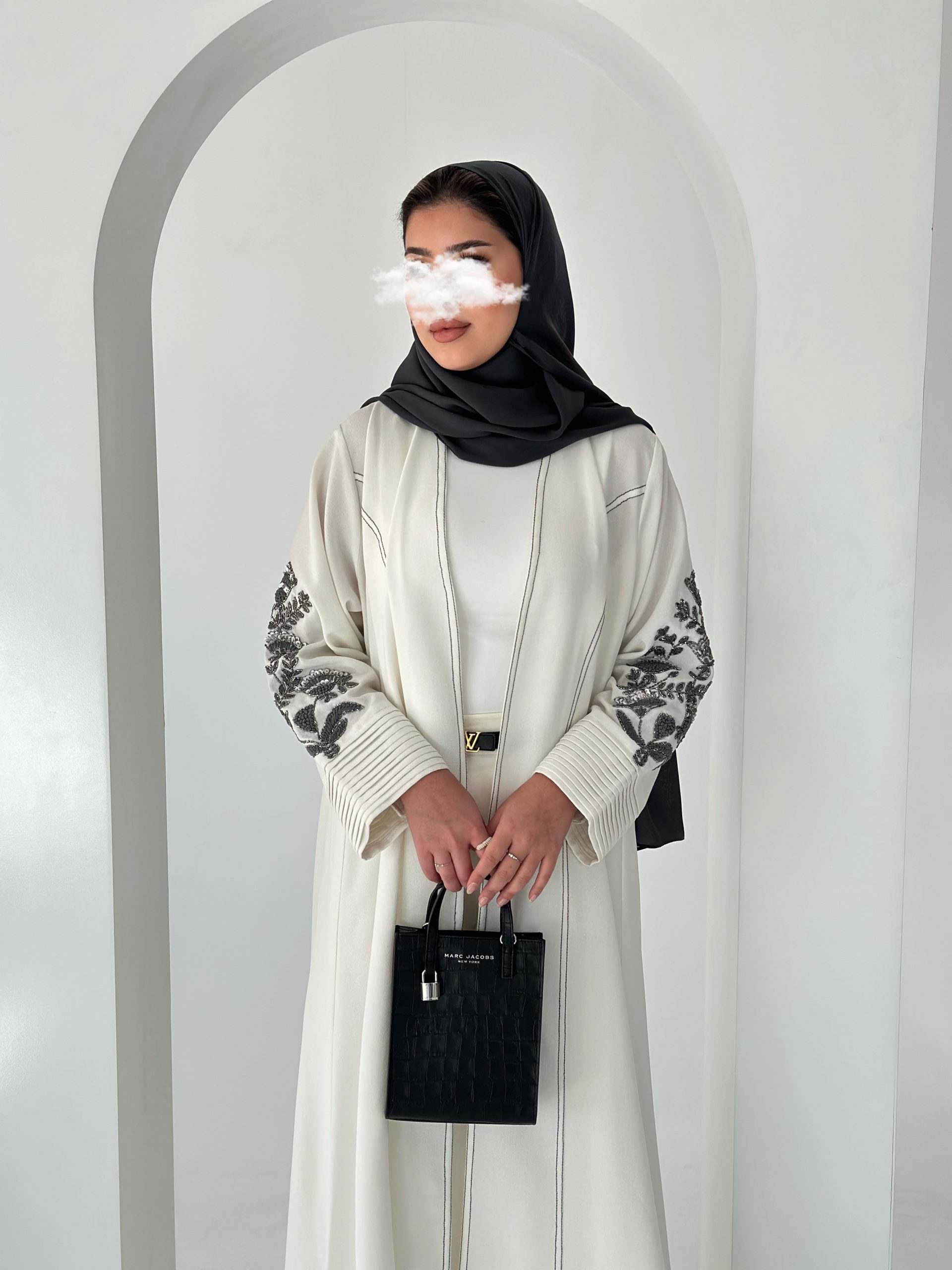 عباية بيضاء بقماش الكريب مع شك فضي و تطريز باللون الرصاصي.