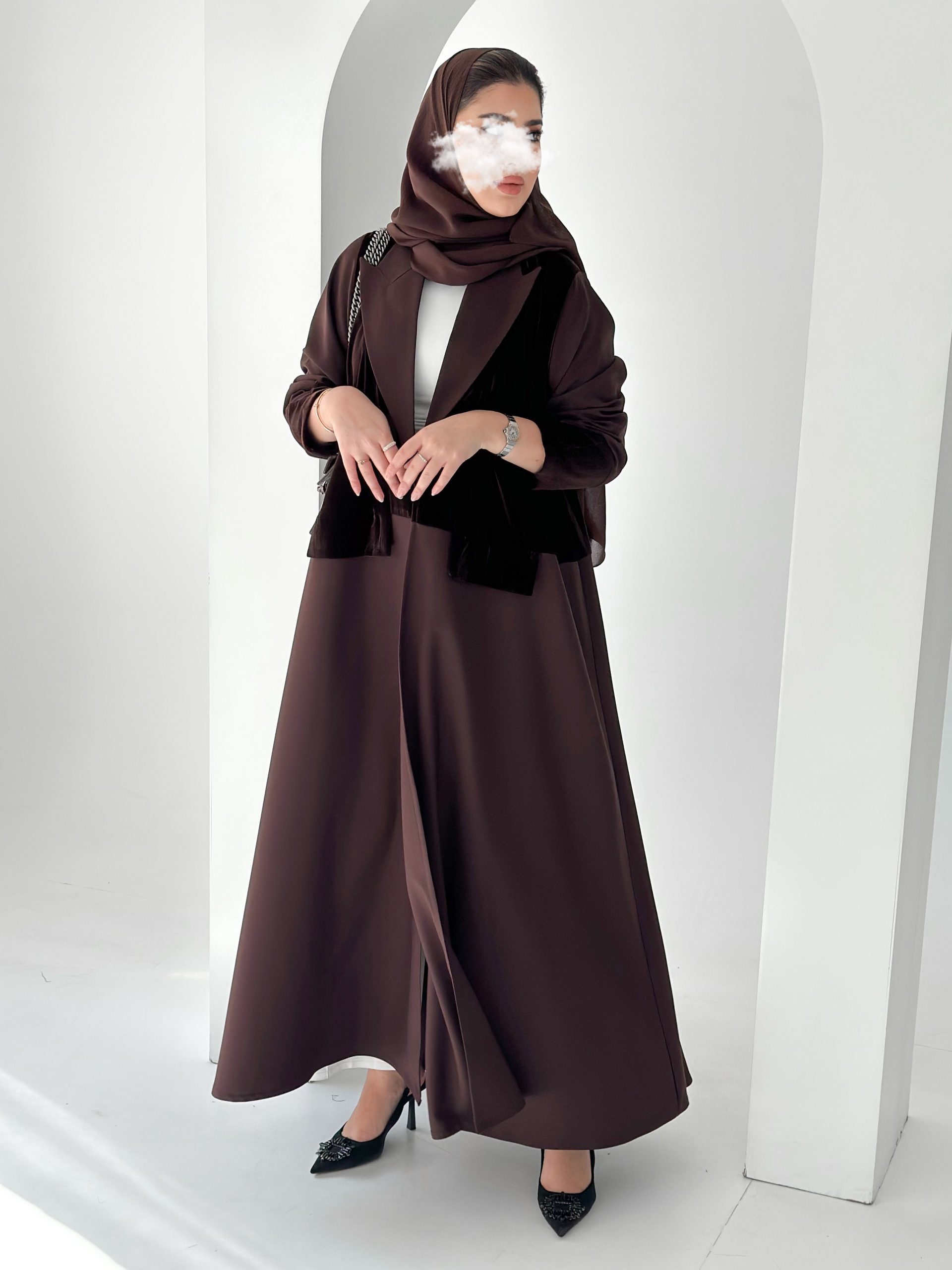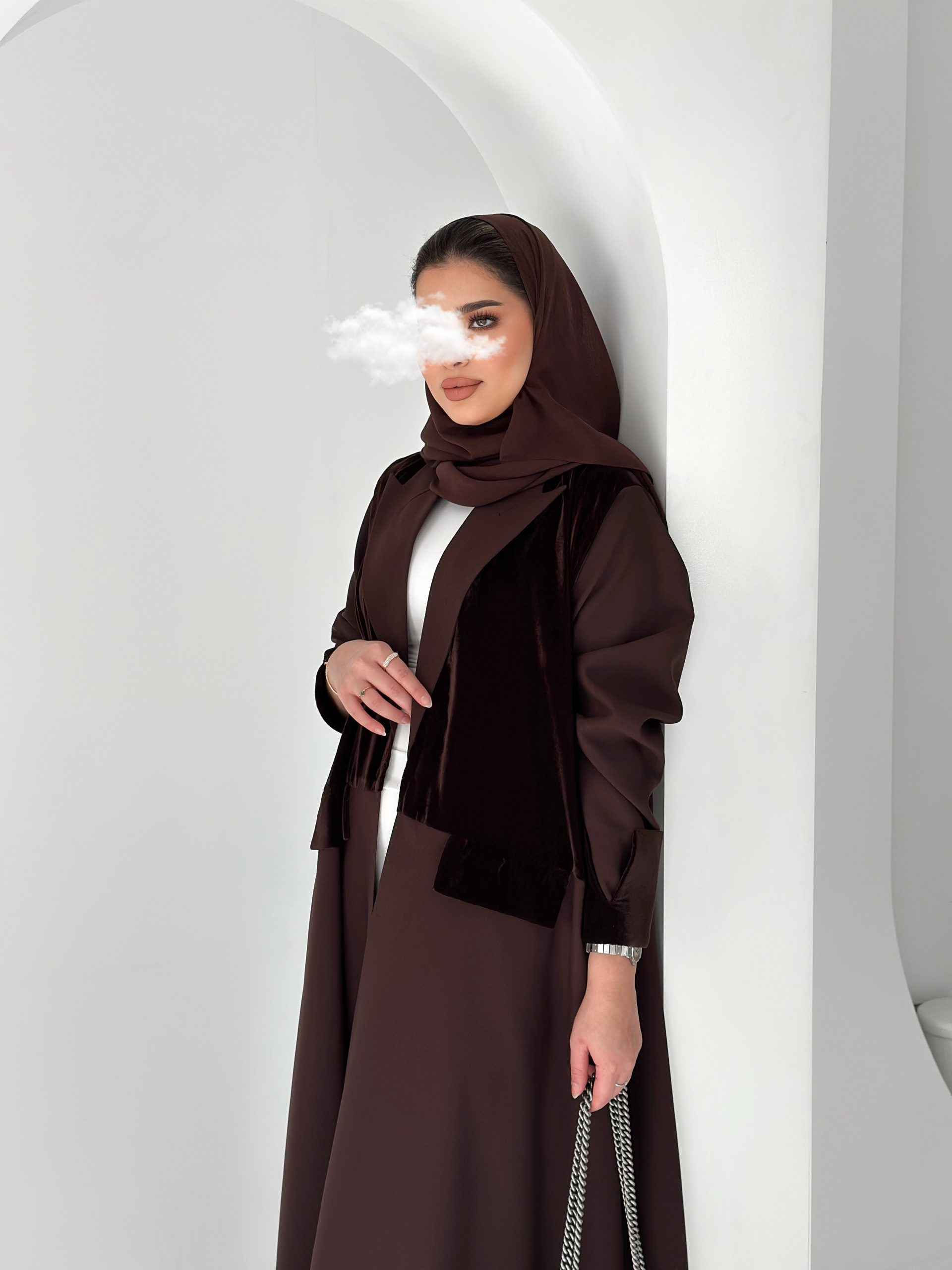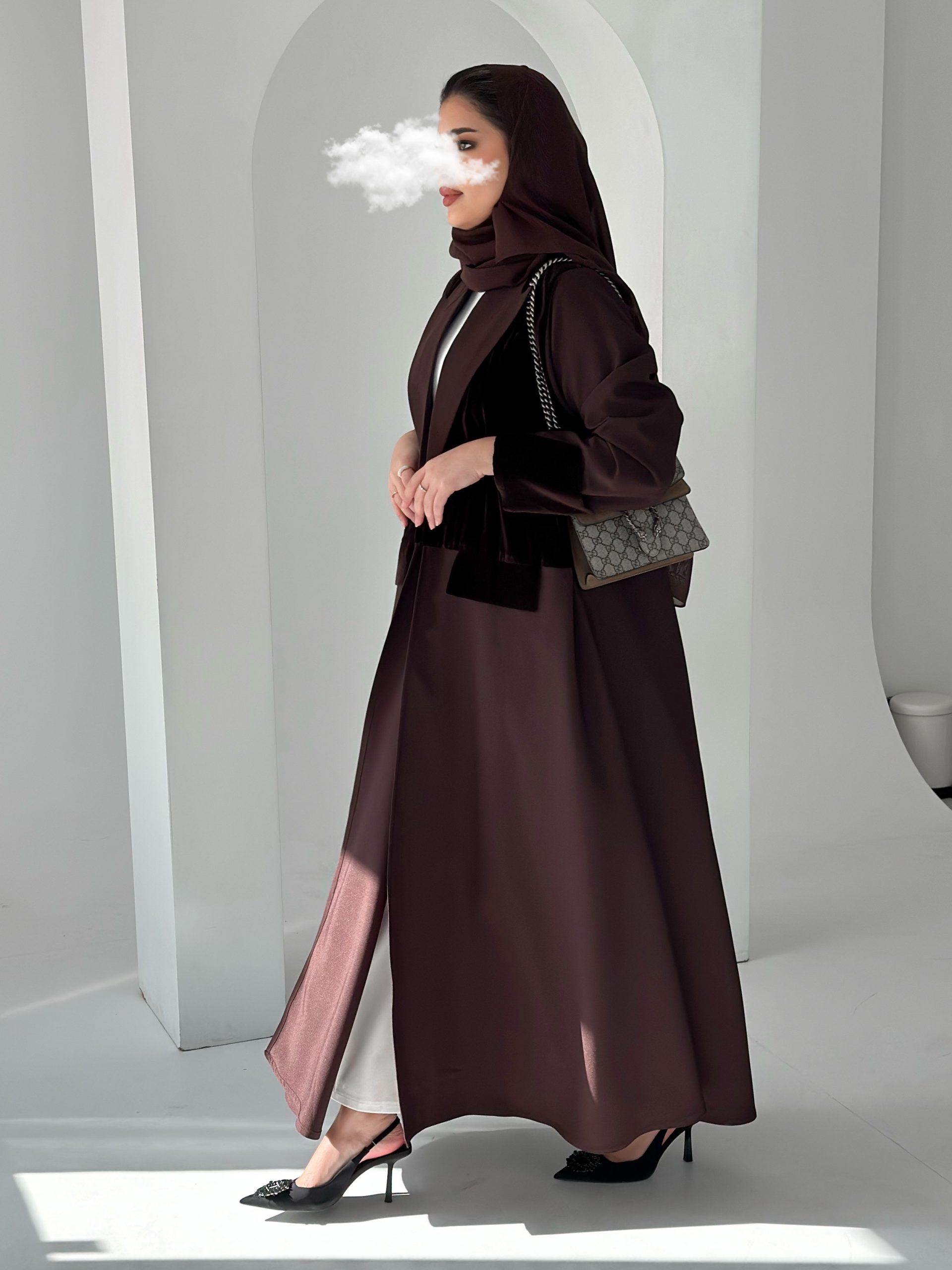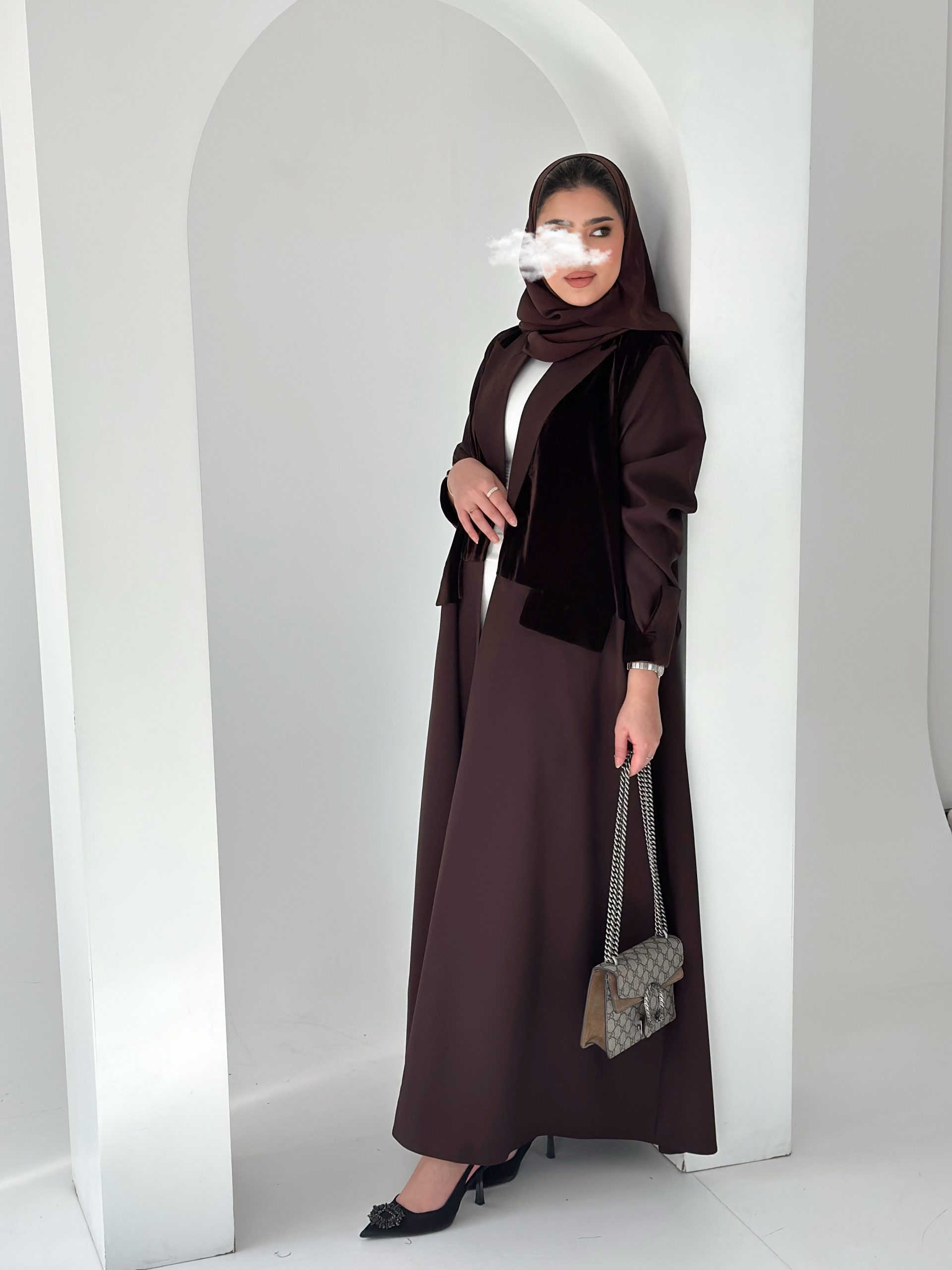 عباية شتوية باللون البني بقماش المخمل و المنيميت.