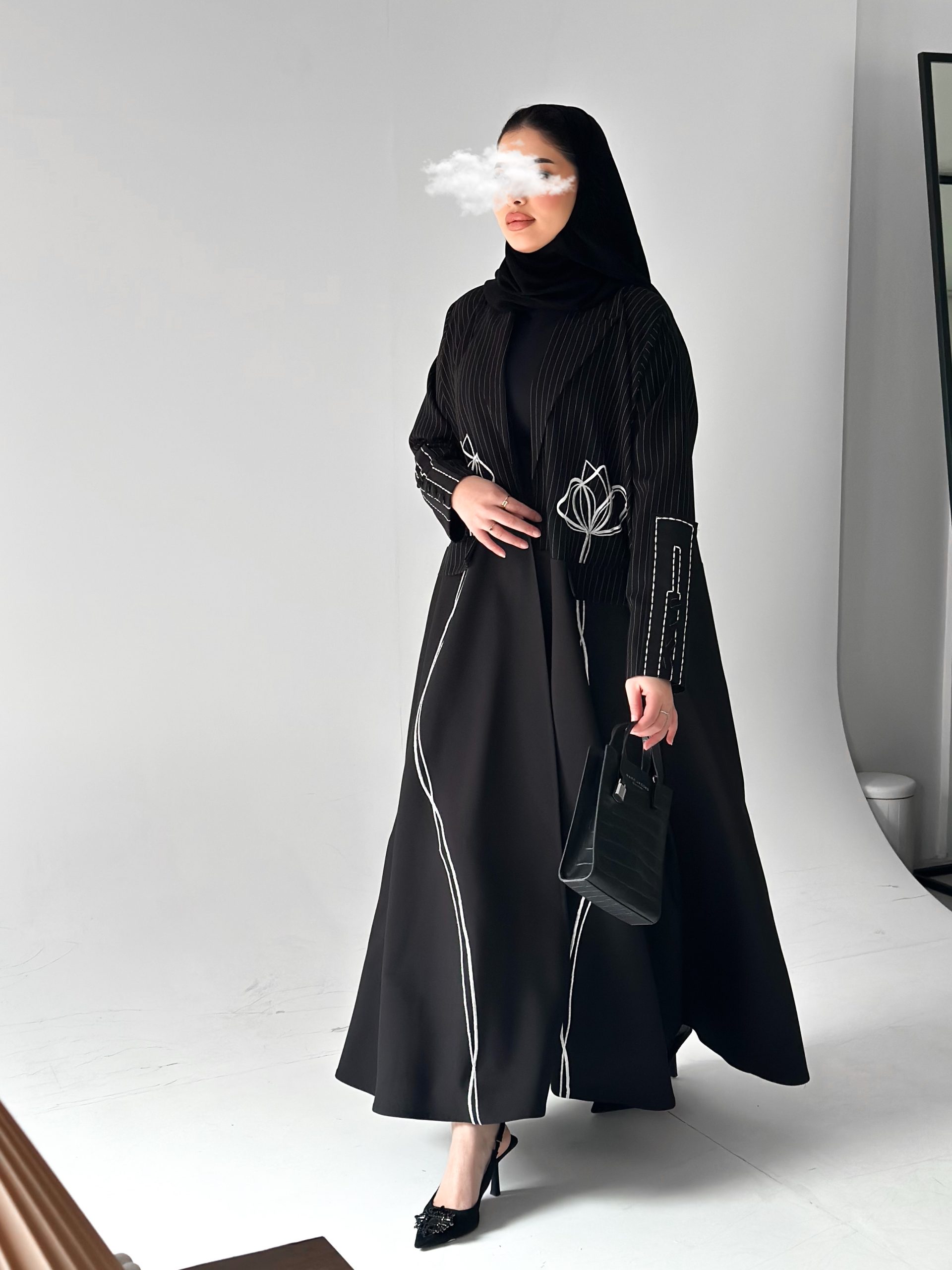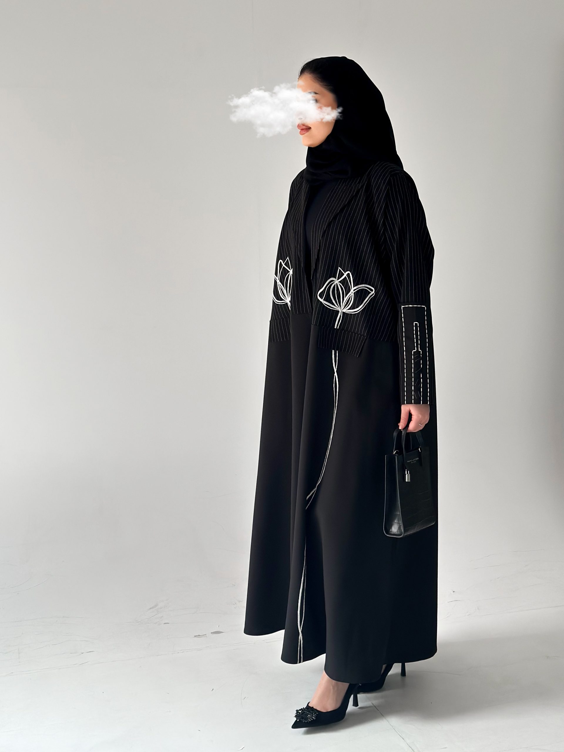 عباية بالون الاسود مع تطريز الورود من امام العباية و في الايادي.
