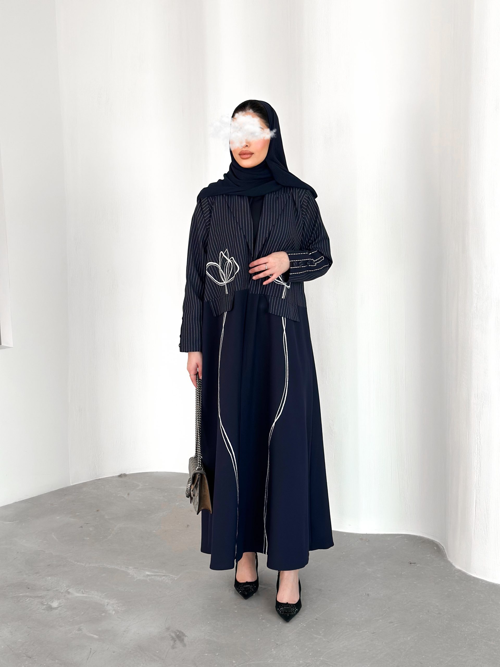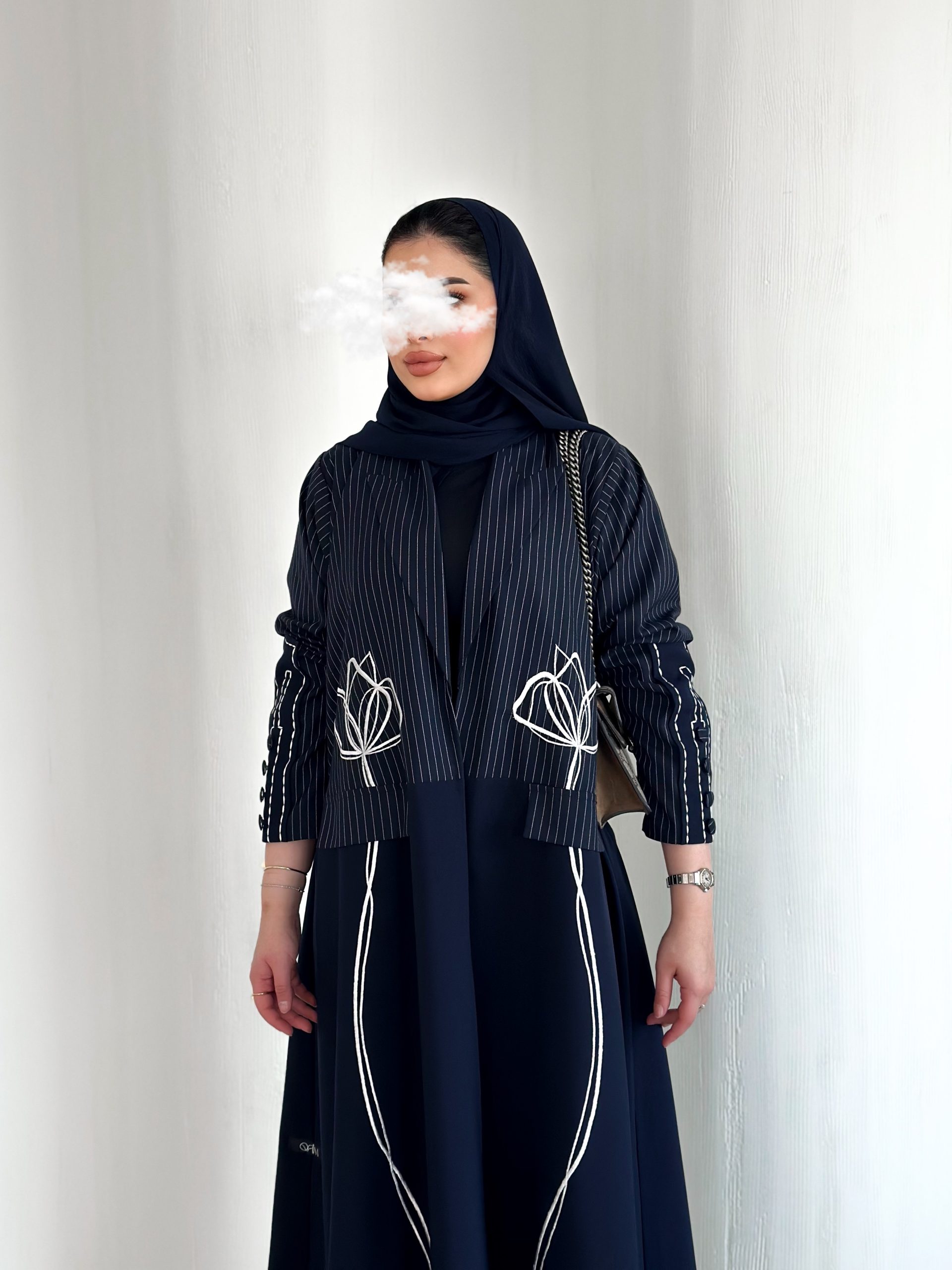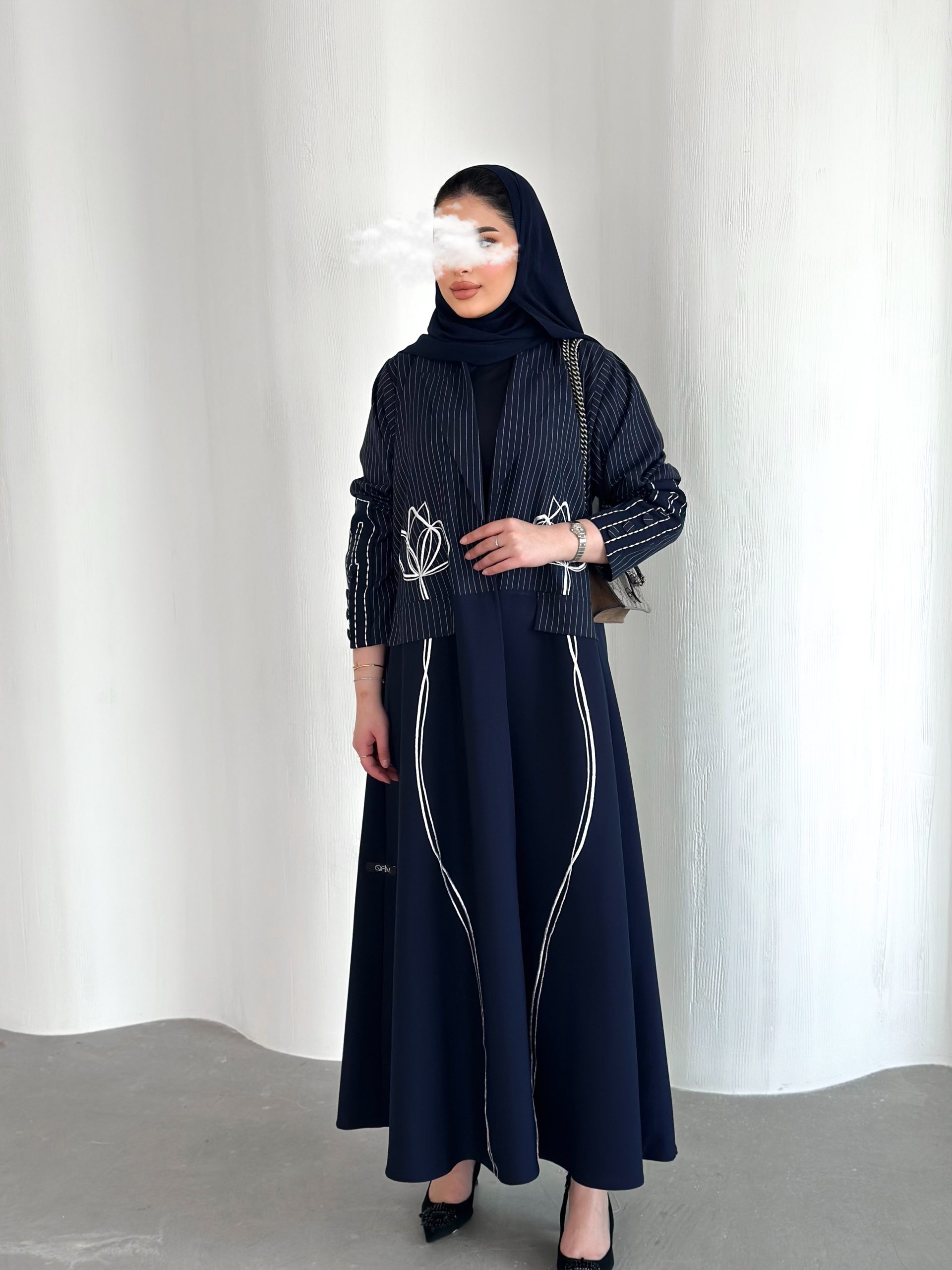 عباية بالون الكحلي مع تطريز الورود من امام العباية و في الايادي.