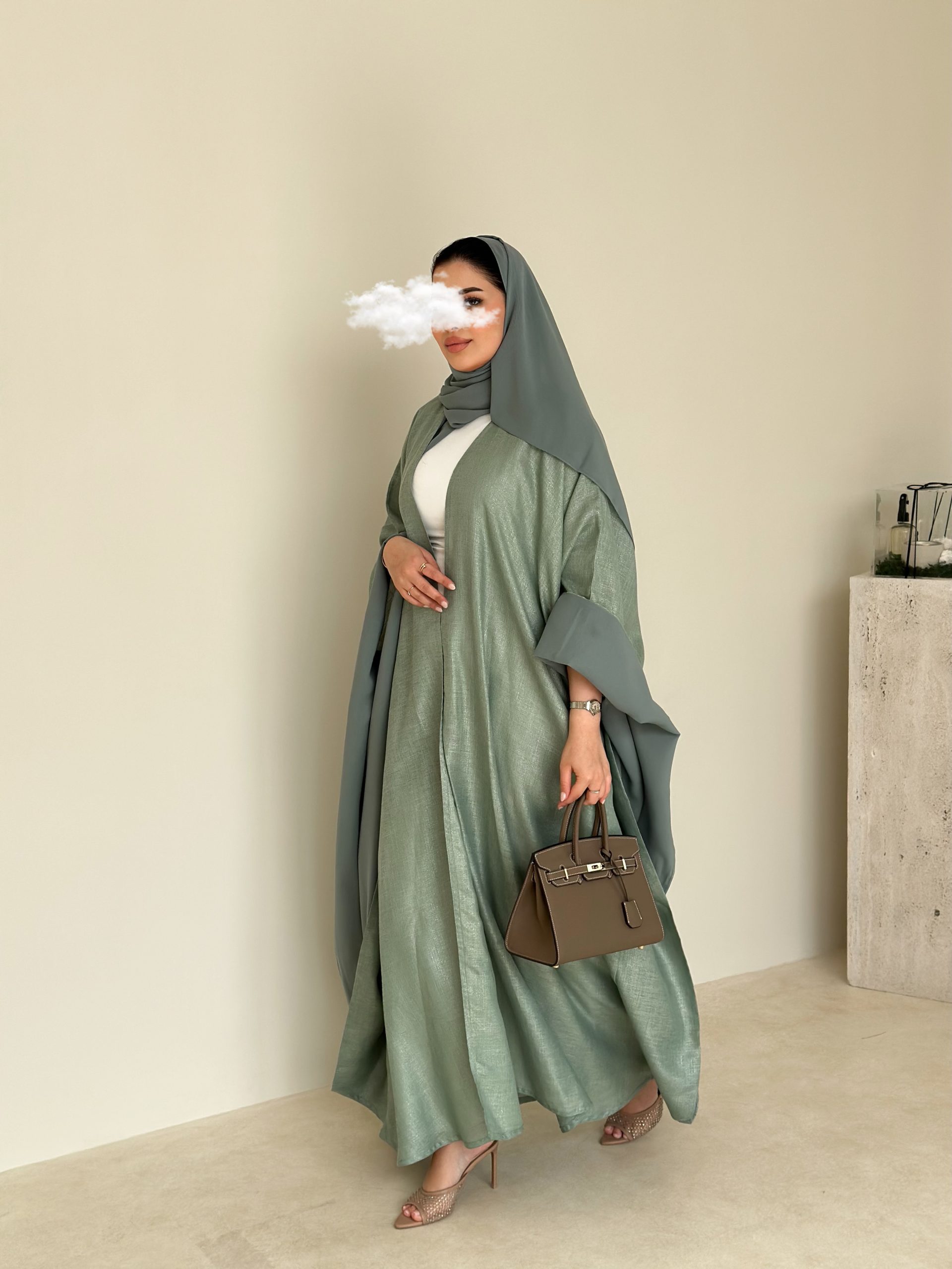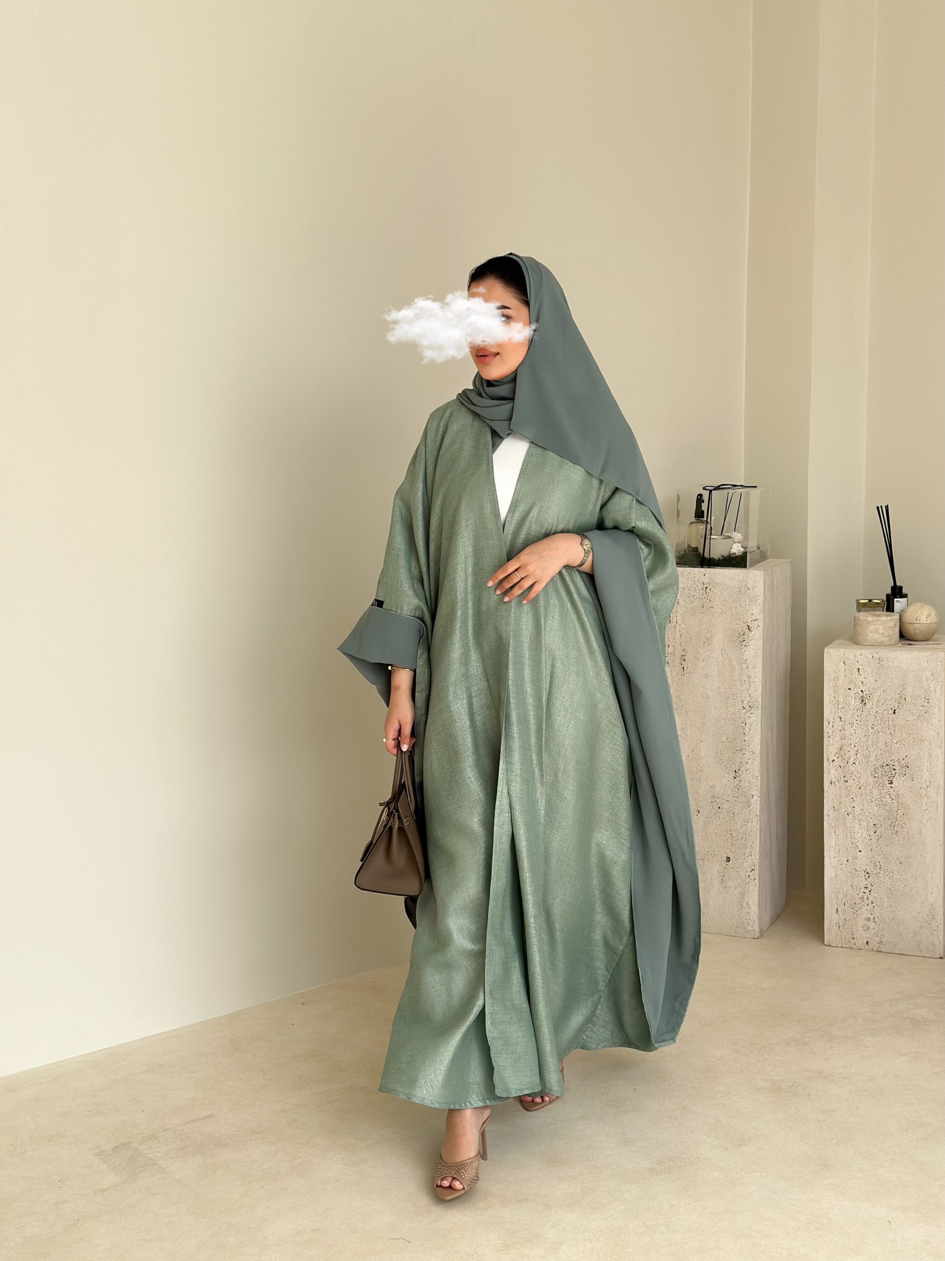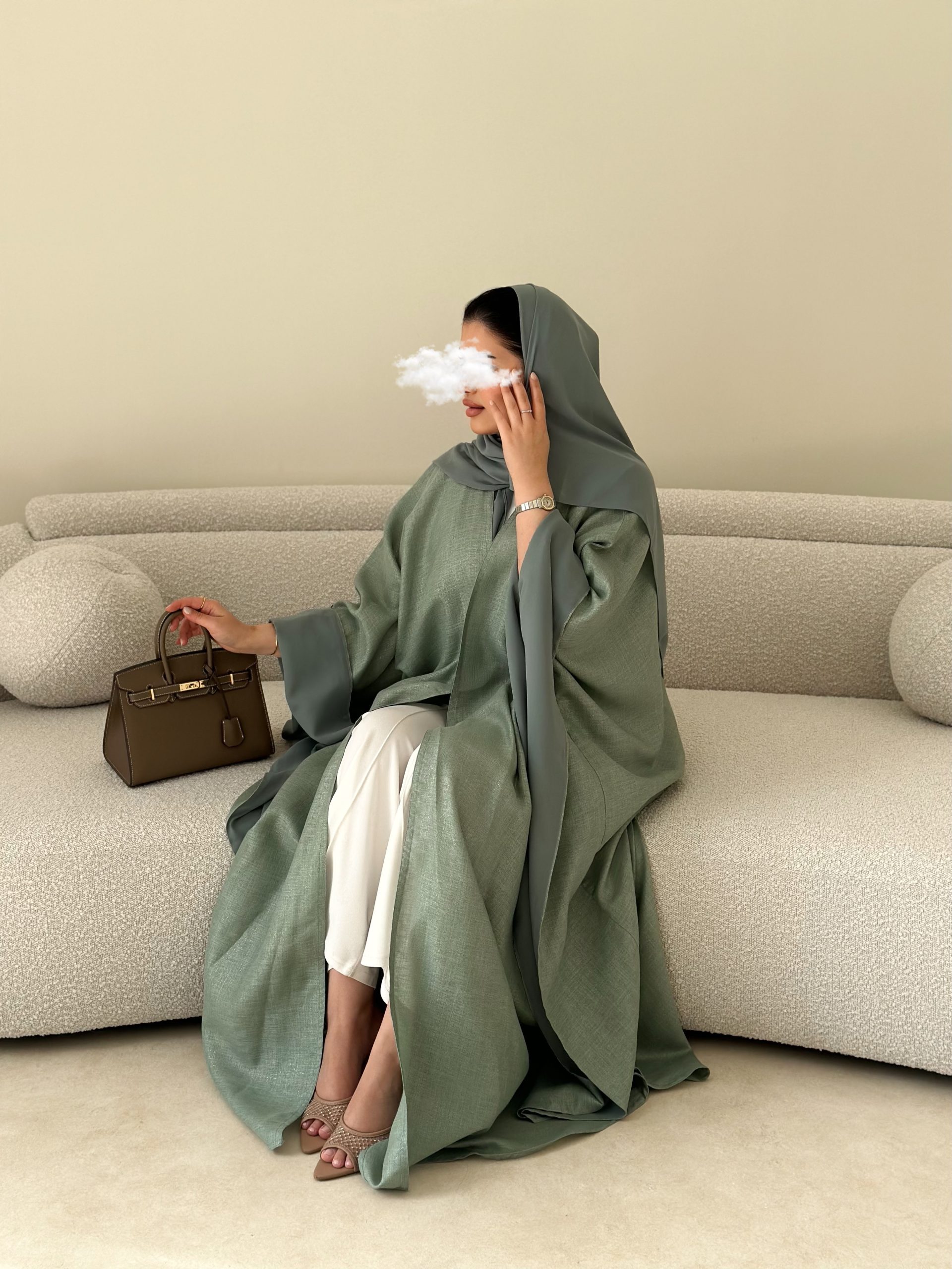 عباية بقصة البشت بلون الاخضر مع تبطين الايادي الى تحت.