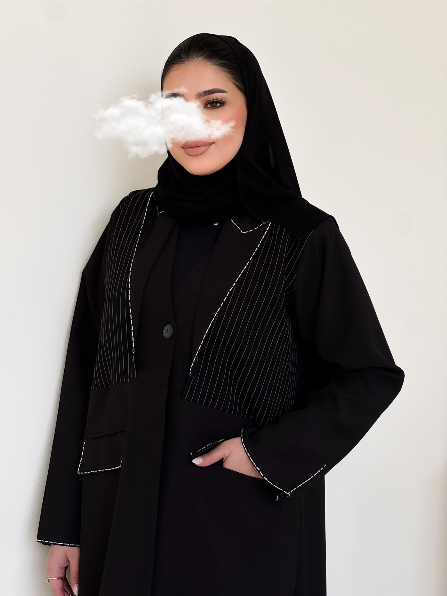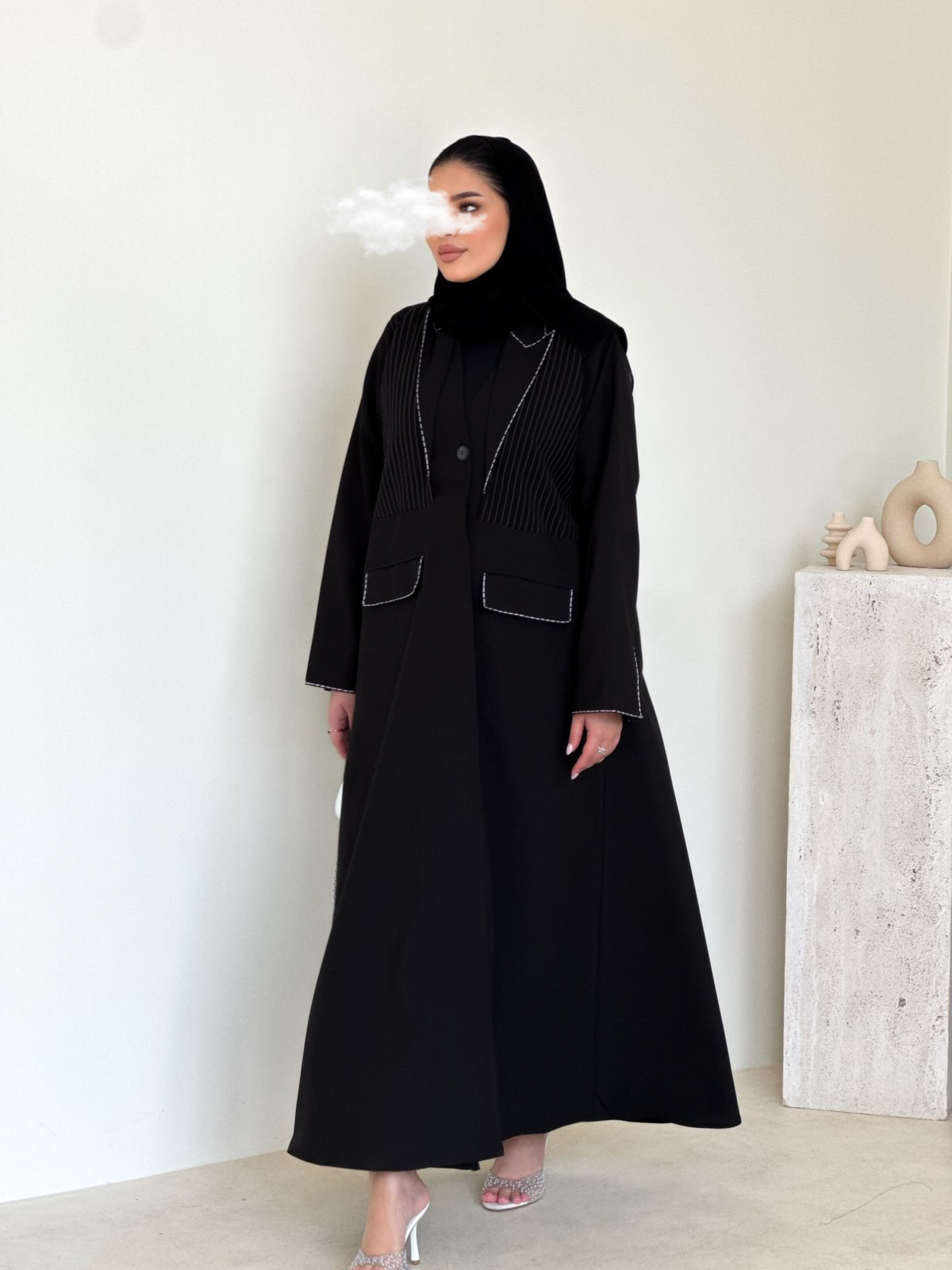 عباية بقماش المنيميت المخطط و الساده المطرز.