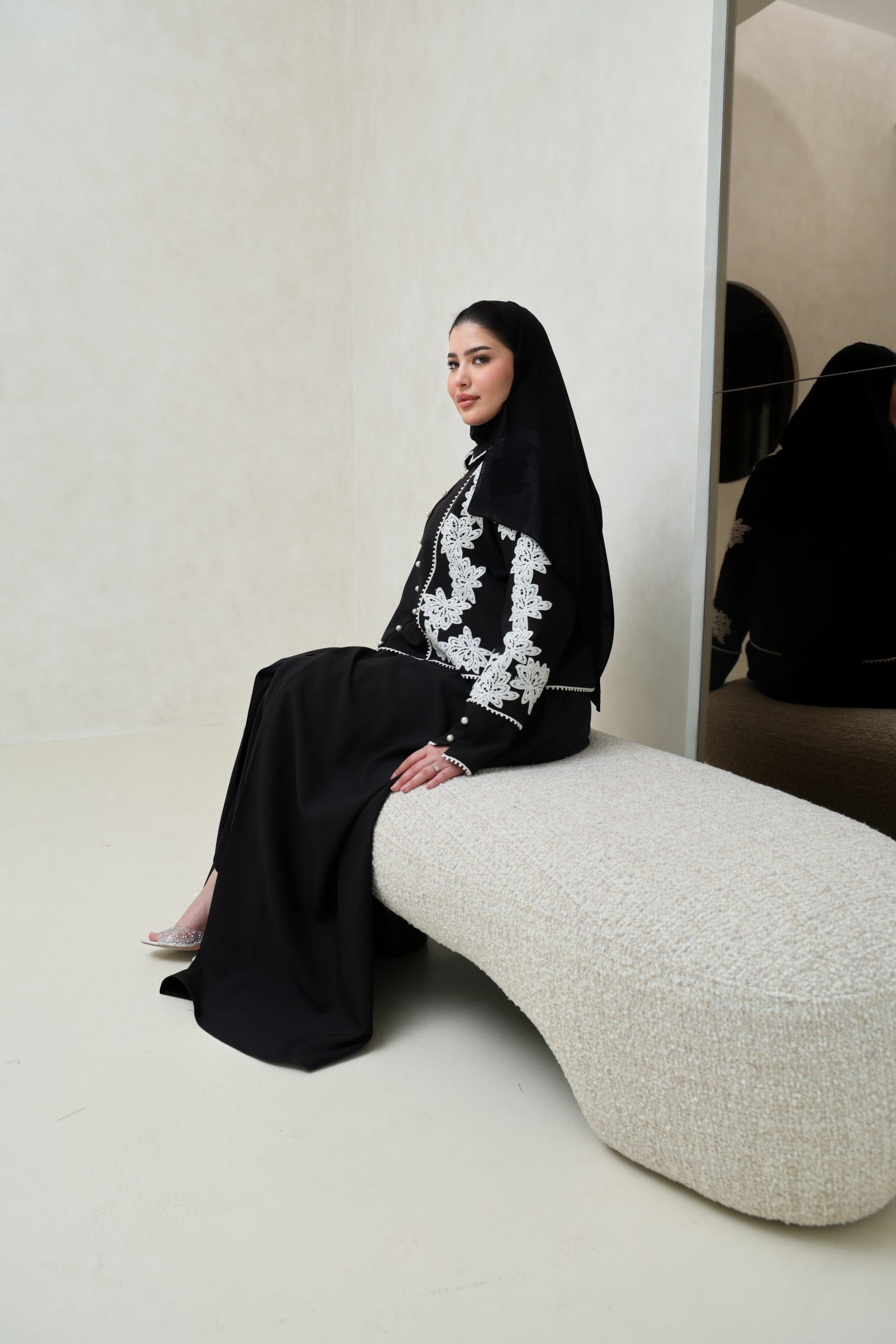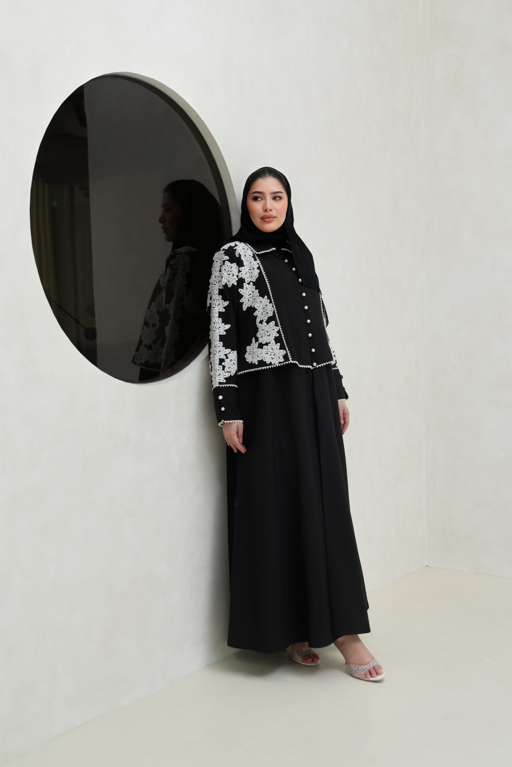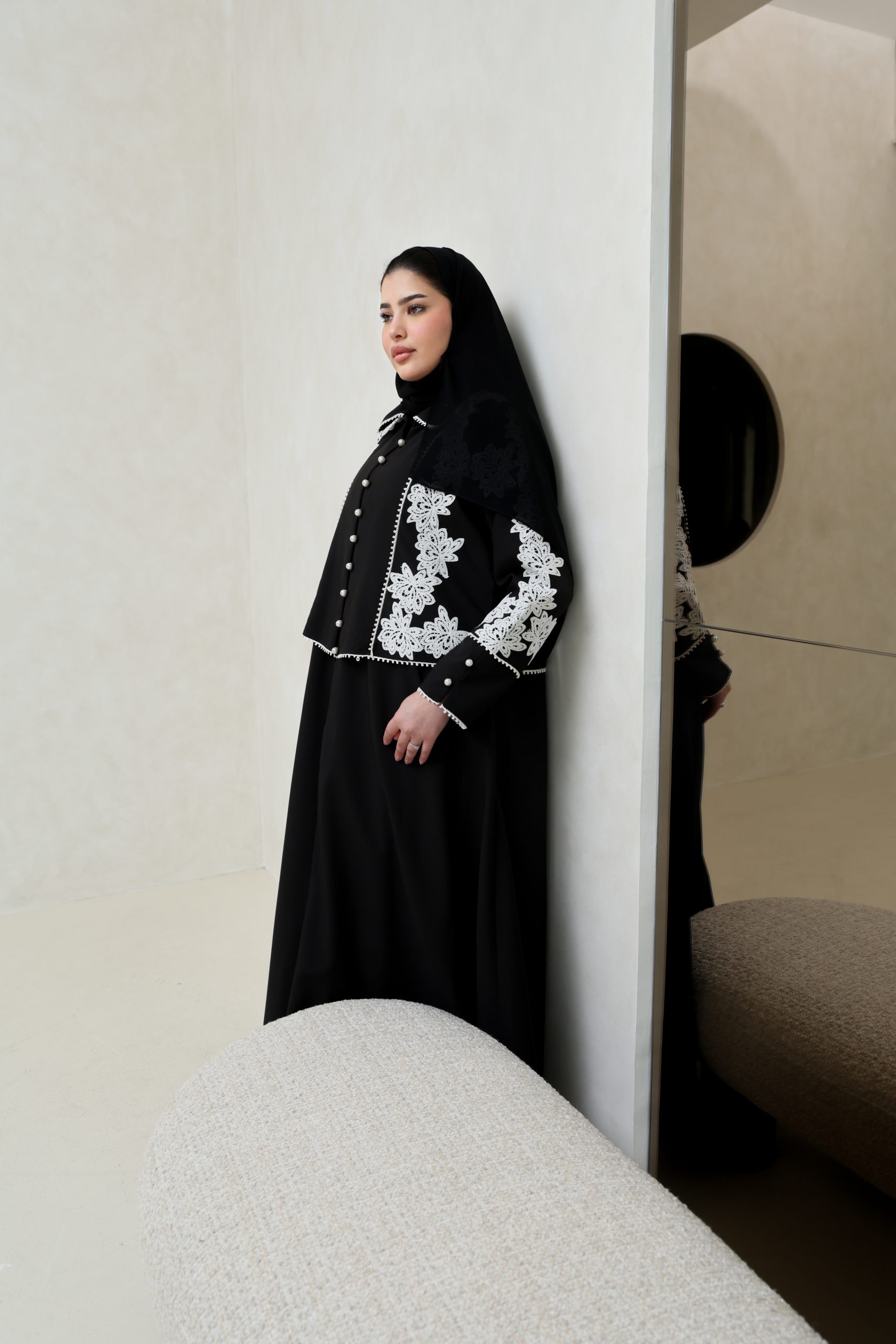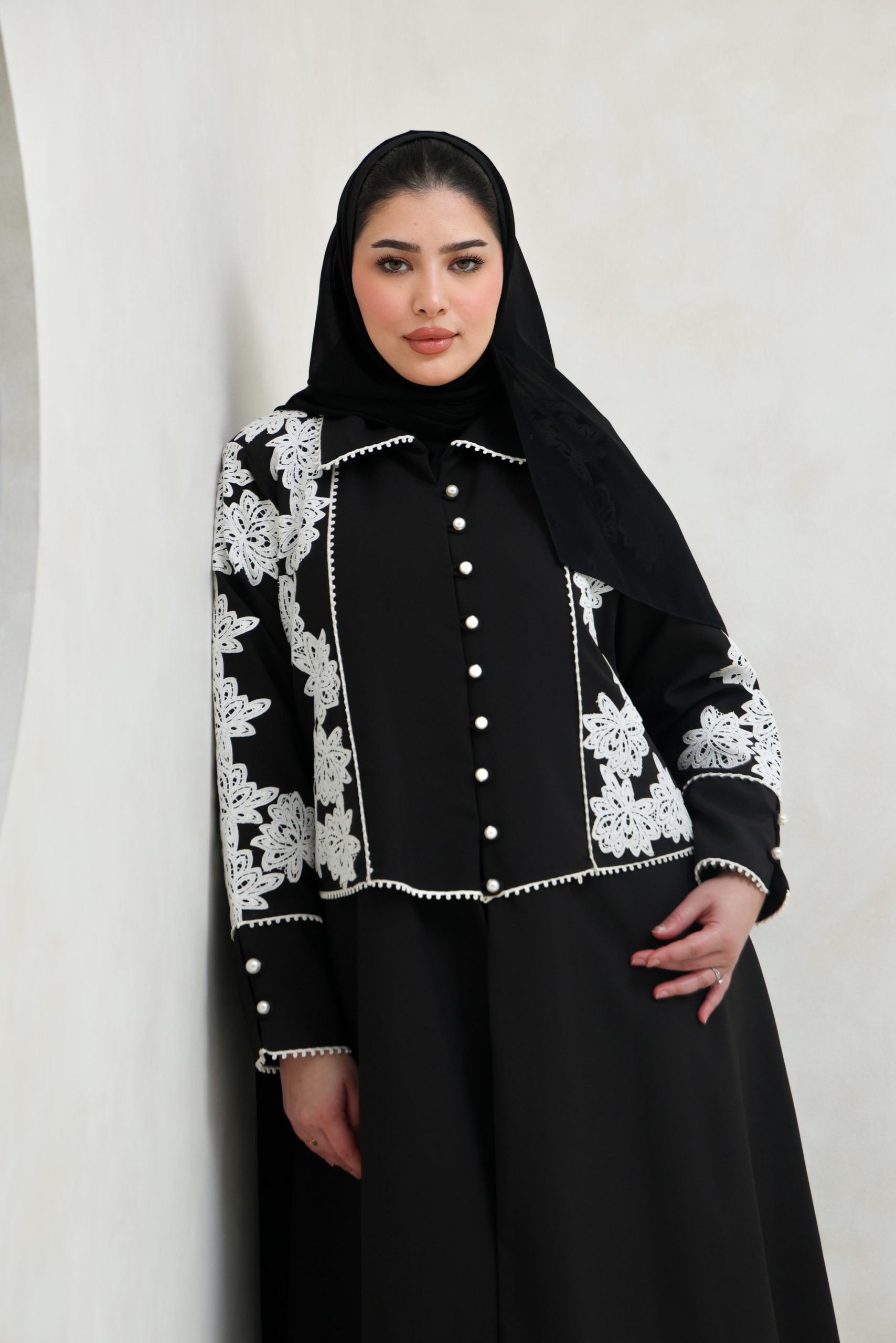 عباية سوداء انيقة مع إضافة الدانتيل الأبيض و اللؤلؤ